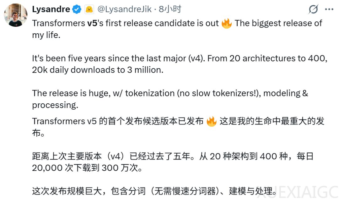 Hugging Face发布了Transformers v5的首个候选版本v5.0.0rc0,标志着这一全球最流行的AI基础设施库正式跨越了从v4到v5长达五年的技术周期。自2020年11月v4版本发布以来,Transformers的日下载量已从2万次激增至超过300万次,总安装量突破12亿次。该库支持的模型架构从最初的40个扩展至超过400个,涵盖文本、视觉、音频及多模态领域,社区贡献的模型权重超过75万个。