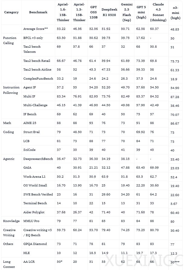 ServiceNow人工智能团队最新发布的Apriel-1.6-15b-Thinker模型,以150亿参数的轻量级体量,在多模态推理能力上实现了显著突破。该模型不仅击败了体量大其十倍的对手,还将推理Token的消耗量降低了30%以上,精准卡位企业级应用的高效甜蜜点。在Artificial Analysis Index中,Apriel-1.6获得了57分的高分,超越了Gemini 2.5 Flash、Claude Haiku 4.5等知名模型,并达到与Qwen3 235B A22B相当的水准,同时保持了极高的能效比。