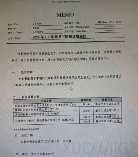 宁德时代宣布自2026年起对1-6职级员工基本工资上调150元,创始人曾毓群确认该举措旨在吸引和保留人才。尽管网友对涨幅评价不一,但舆论整体持肯定态度。数据显示,2024年公司人均薪酬达23.63万元,前三季度净利润同比增长36.2%至490亿元。
