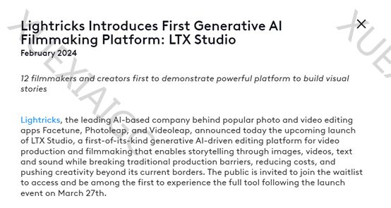 2月29日,Lightricks宣布推出生成式AI电影制作平台LTX Studio,用户输入文本即可生成超过25秒的微电影视频,并对视频细节进行可视化控制。