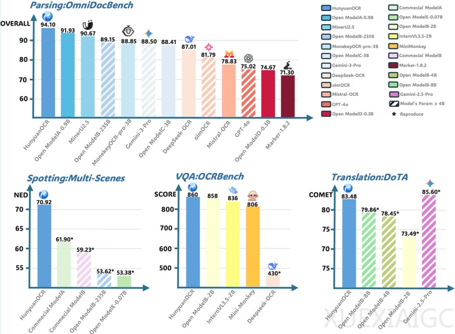 腾讯混元大模型团队推出的HunyuanOCR模型是一款商业级开源视觉语言模型,专为OCR任务设计,参数规模仅1B,兼具轻量与高性能特性。该模型在文本检测识别、复杂文档解析等感知任务上超越所有公开方案,并在ICDAR 2025 DIMT挑战赛小模型赛道夺冠,OCRBench上创下3B以下模型最优成绩。其技术架构融合原生ViT与轻量LLM,通过三大突破解决行业痛点:全能与高效统一、极简端到端架构、数据驱动与RL创新,目前已登陆Hugging Face趋势榜前四,GitHub标星超700。