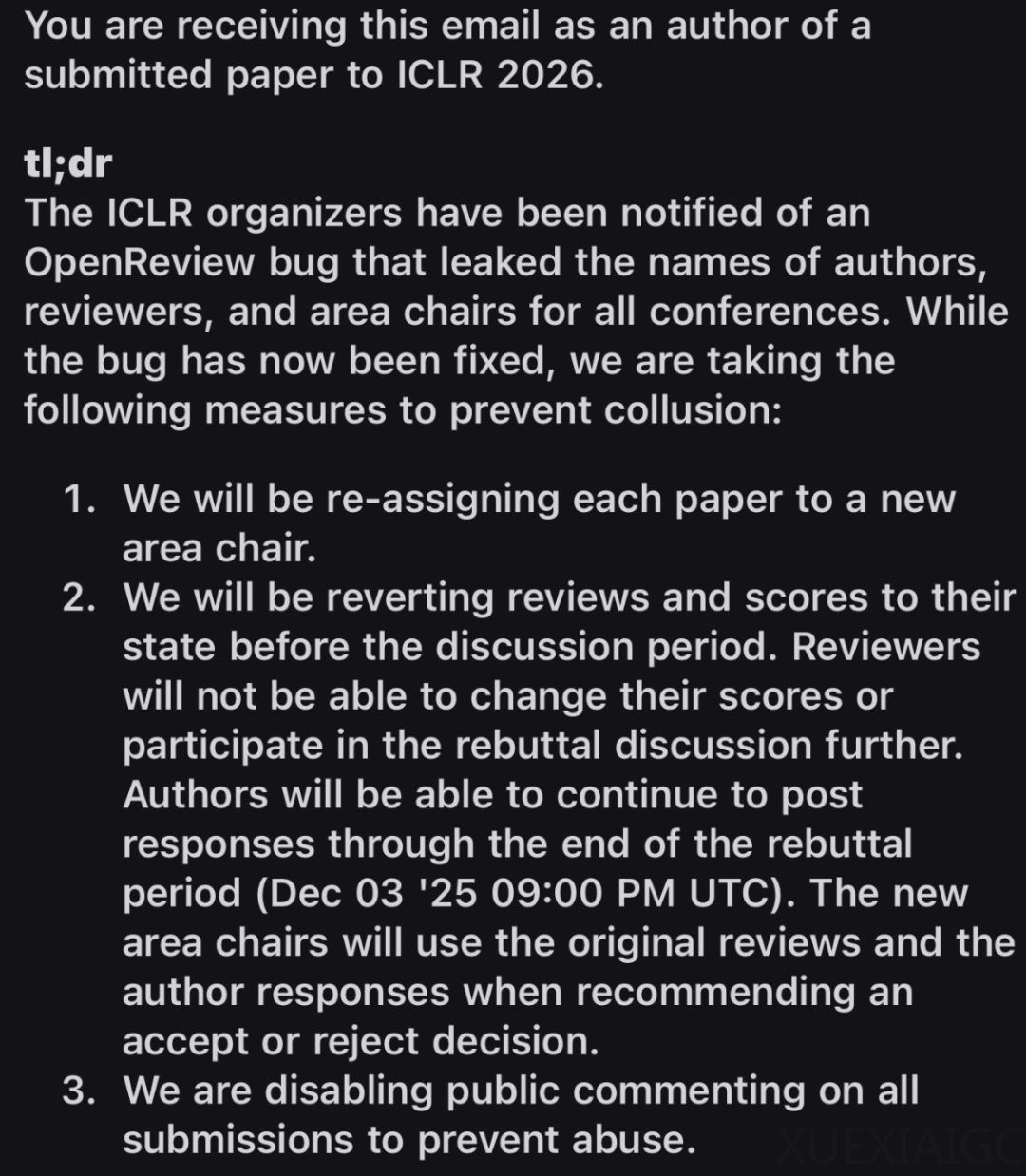 近期,ICLR(国际学习表征会议)因系统漏洞导致评审信息泄露,随后官方宣布将所有论文的审稿意见和评分重置至讨论阶段前的状态,并重新分配领域主席(AC)。这一决定在学术界引发强烈反响。许多作者表示,他们此前为反驳审稿意见投入大量精力,甚至通过补充实验成功提升评分,但重置措施使这些努力化为乌有。