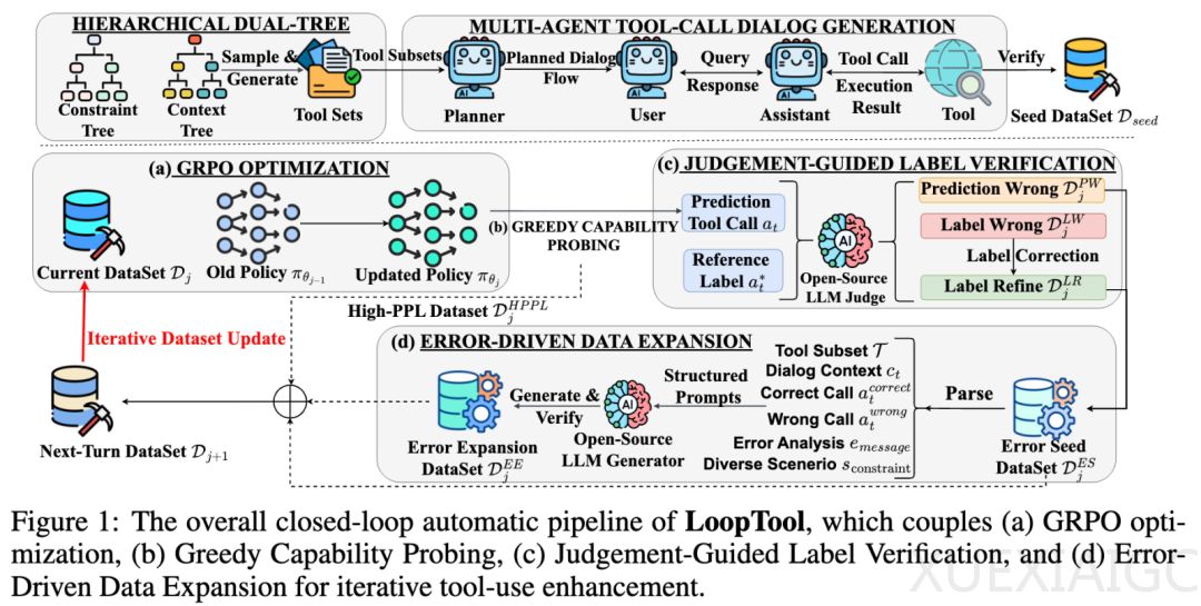 工具增强型大语言模型已在多领域证明其价值,但要让模型稳健地使用工具,需要持续提供与其当前水平匹配的高质量训练数据。目前主流方法采用静态流程,缺乏对模型学习状态与短板的实时反馈。此外,使用闭源生成/评估模型成本高,而开源模型则容易引入标签错误。LoopTool的核心思想是让数据生成、标签修正与模型训练形成自动化闭环,由模型性能反馈驱动下一轮数据优化。这一过程包括种子数据构建与迭代优化闭环两大阶段,后者细分为四个核心模块:GRPO强化学习训练、贪婪能力探测、判别引导标签校验和错误驱动数据扩展。