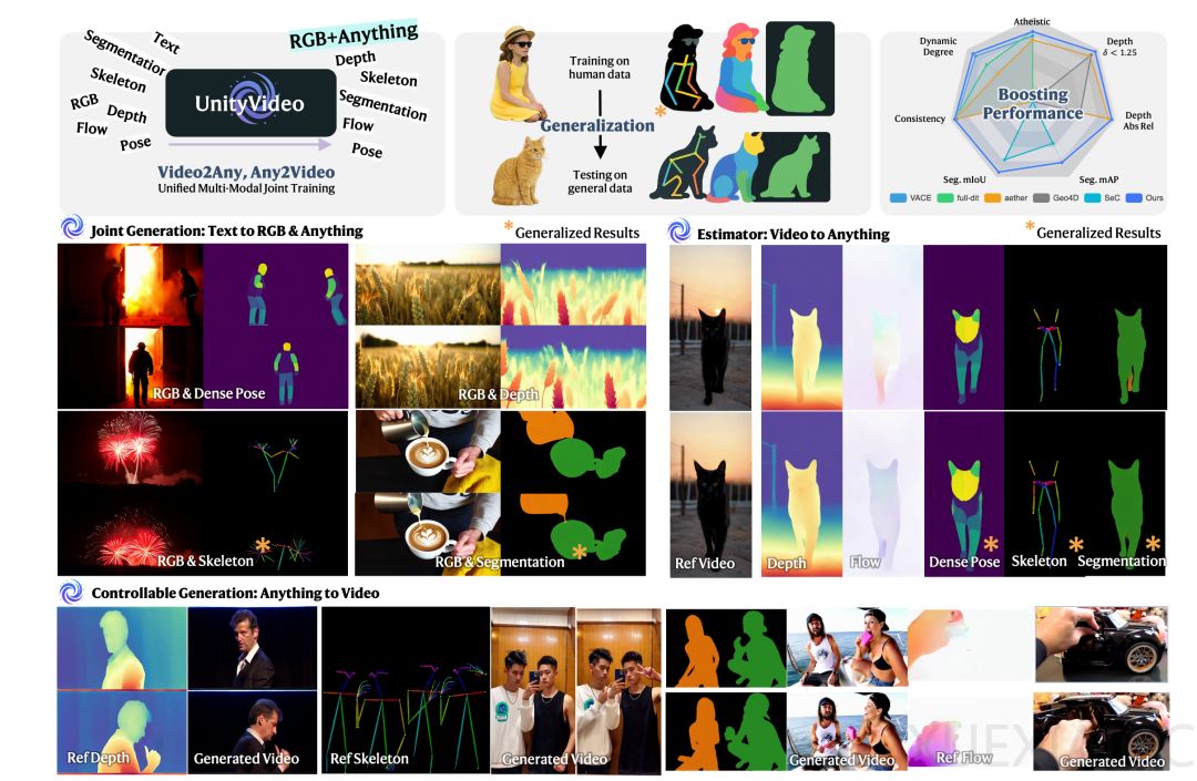 统一多模态多任务的视频生成模型UnityVideo通过整合多种视觉模态,显著提升了模型对物理世界的理解能力和生成质量。该模型由港科大、港中文、清华大学和快手可灵的研究团队联合开发,其核心创新在于将深度图、光流、骨骼、分割掩码等多种视觉模态统一训练,使模型能够更全面地理解场景的几何结构、运动模式和物体关系。这种多模态联合训练不仅加速了模型收敛,还带来了性能的显著提升,特别是在物理现象建模和零样本泛化方面展现出突出优势。