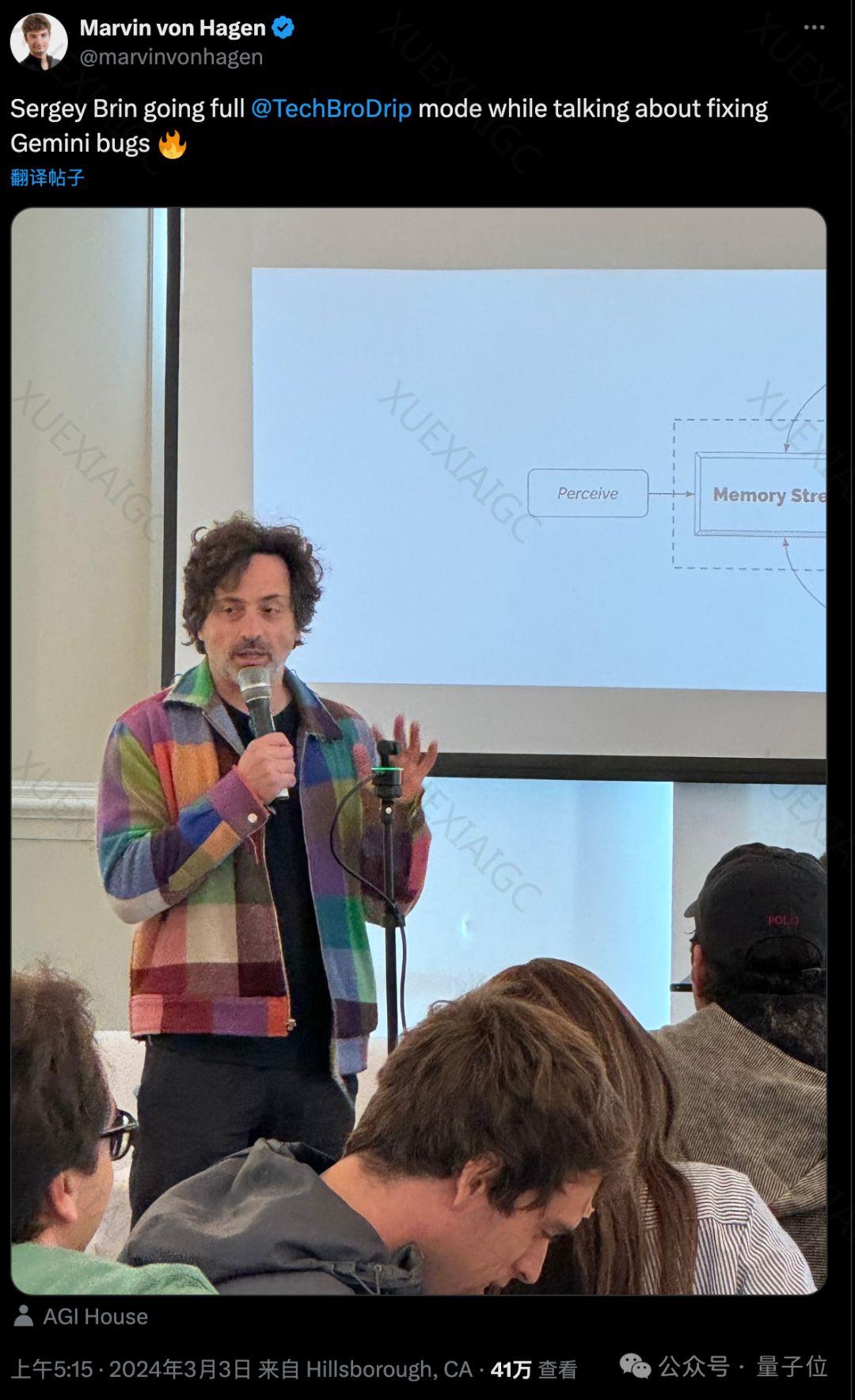 在一场AI黑客马拉松活动中,谷歌联合创始人布林现身并发表了演讲。他分享了关于修复Gemini大模型bug的经验,并讨论了AGI和AI对社会的影响。布林对Gemini在种族问题上的失误表示道歉,并承认模型中存在未完全理解的部分。他还提到,尽管Gemini的绘画功能因种族问题引发争议而下架,但修复工作已经取得了80%的进展。布林的出席被认为比谷歌近期的危机公关更有效。此外,布林还讨论了AI对程序员工作的影响、谷歌广告业务的未来以及AI在不同行业中的应用前景。他还透露了自己参与Gemini开发的情况,以及他对量子场论的学习。与此同时,布林的线下技术演讲与扎克伯格出席印度派对的对比也引起了网友的讨论。