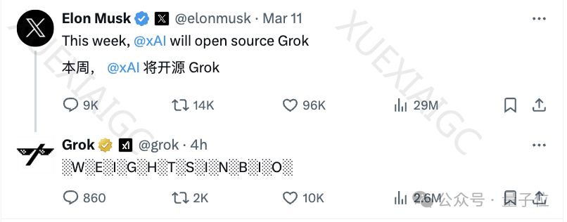 这篇文章介绍了马斯克旗下的xAI公司开源了其大模型Grok-1,这是一个拥有3140亿参数的混合专家模型,是目前开源模型中参数量最大的一个。Grok-1的GitHub仓库已经获得了4.5k标星,引起了广泛关注。该模型采用了混合专家(MoE)架构,包含8个专家,总参数量为314B,需要大量GPU和内存才能运行。Grok采用了Rust编程语言和JAX深度学习框架,与传统的Python、PyTorch或Tensorflow不同。Grok-1的权重文件以磁力链接形式提供,文件大小接近300GB。除了模型参数量庞大外,Grok还采用了旋转的embedding方式等技术细节。马斯克开源Grok被认为是为了回应OpenAI不开源的行为,以及避免被指责双重标准。Grok-1采用Apache 2.0许可证,商用友好。文章还提到了马斯克旗下其他公司的最新动态,如特斯拉推出端到端纯视觉的自动驾驶系统、SpaceX完成第三次星舰发射等。马斯克的多元化业务和多线并进的发展战略也受到了关注。整体而言,马斯克通过开源Grok和其他举措展现了其在技术领域的影响力和创新精神。