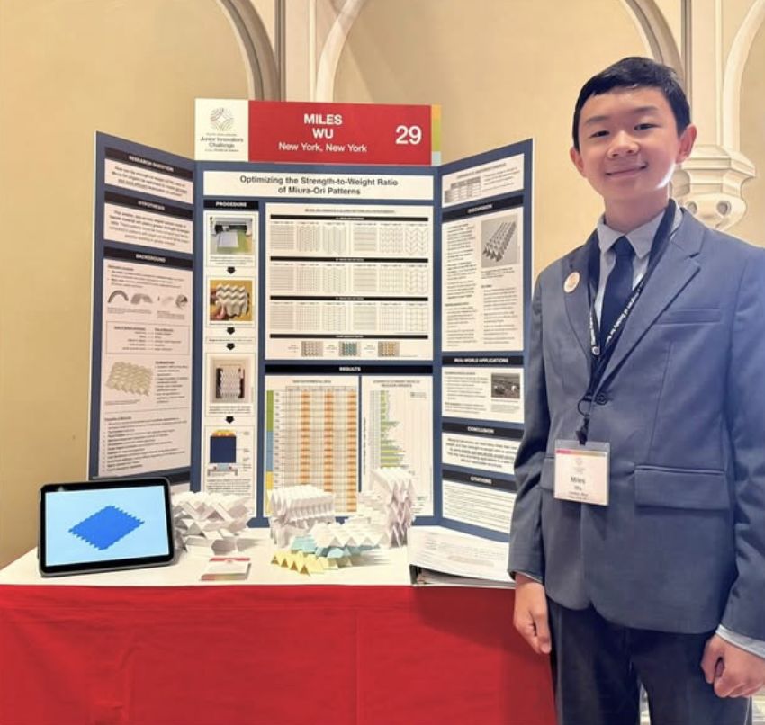 三浦折纸结构的独特几何特性使其在空间工程领域具有重要价值。这种结构只需沿对角方向施力即可快速展开或折叠,节省空间且减少机械损耗。迈尔斯的研究灵感来源于此,并通过实验验证了其超强的承重能力。他的成果不仅让评委惊叹,还展现了卓越的领导才能。获奖后,他计划将这一技术应用于设计可快速展开的应急避难所,以帮助应对自然灾害。