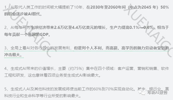麦肯锡的研究报告《生成式人工智能的经济潜力》指出,AI将为全球经济带来巨大增长,预计每年增加2.6万亿至4.4万亿美元的价值。生成式AI的应用可能在未来20年内使劳动生产力提高0.1%到0.6%。报告强调,高薪知识劳动者可能受到最大影响,约50%的职业可能会被AI取代。AI的影响主要集中在客户运营、营销和销售、软件工程和研发等领域。在银行业、高科技行业和生命科学等行业,AI的应用将显著提高生产力。智能革命将引领生产力飞跃提升,但也需要我们重新思考教育体系、职业规划和社会支持体系,以适应技术变革。