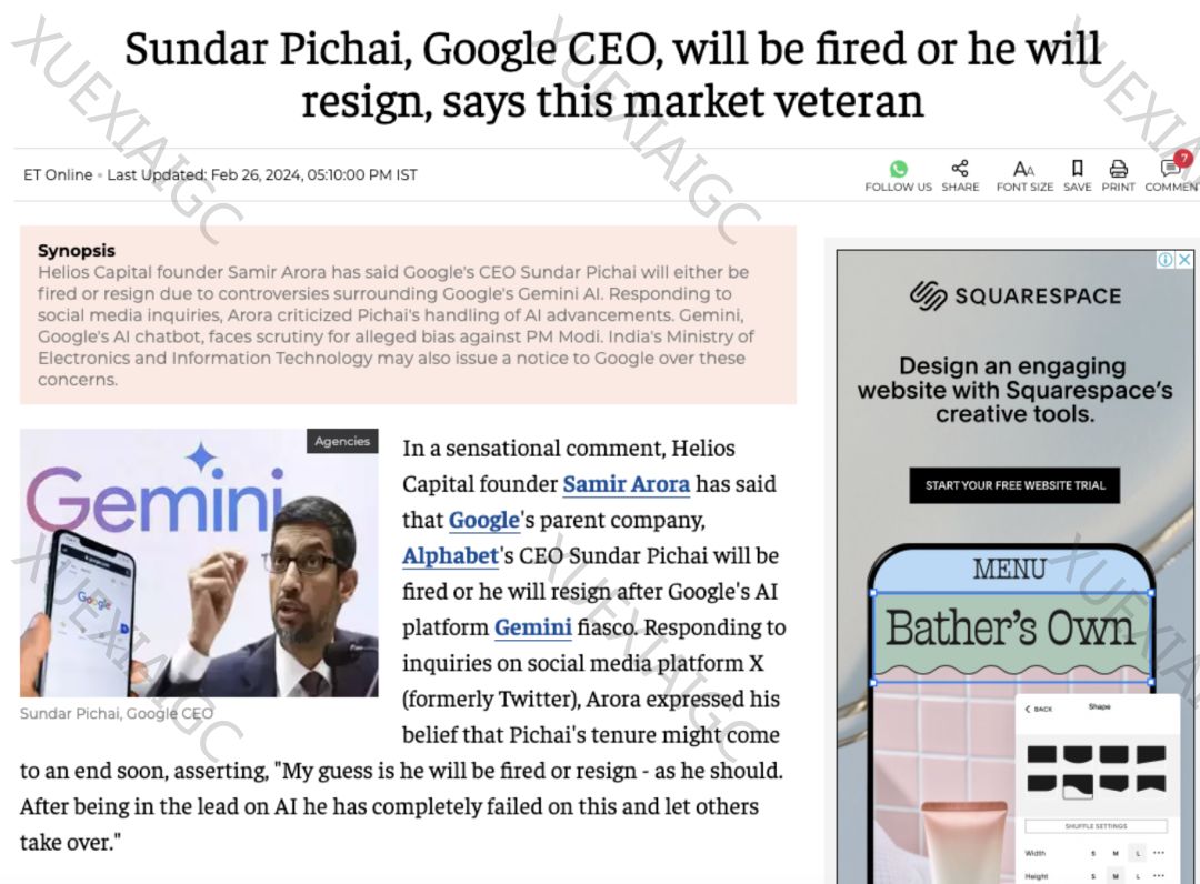 谷歌的Gemini Pro 1.5发布后,因其无法生成“白人形象”而引发争议,这暗示了可能存在的价值观争议。这一问题让谷歌CEO Sundar Pichai 面临压力,他发表声明表示需要进行根本性的改变。Helios Capital创始人Samir Arora甚至预测Pichai可能会因此被解雇或辞职。