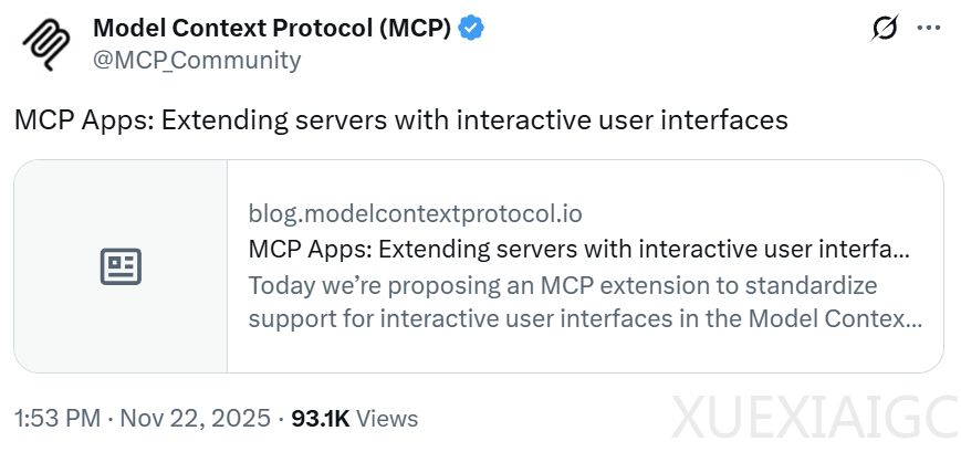 MCP协议作为连接AI模型与数字生态的「神经中枢」,长期以来受限于仅支持文本和结构化数据的交互方式,限制了复杂应用场景的发展。近日,MCP社区提出的SEP-1865提案(MCP Apps)试图通过标准化交互式用户界面支持来突破这一瓶颈。该提案引入了一种新模式,允许MCP服务器直接向主机提供可视化操作界面,将传统「命令行式」交互升级为「图形化」体验,例如在对话框中嵌入可交互的仪表盘或参数配置表单。