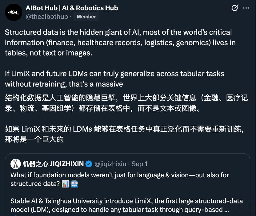 这场从专用模型到通用LDM的范式迁移,正在重构工业智能的基础设施。结构化数据处理作为隐蔽却关键的AGI路径,与语言智能、具身智能形成互补。中国在工业数据规模和政策支持上的优势,为LimiX这类创新提供了独特落地土壤。该模型不仅力压Amazon AWS等国际团队登顶多项基准测试,其开源更标志着我国在该领域站到全球前沿,为产业智能化升级提供了核心驱动力。