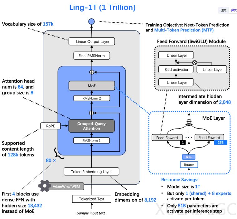 蚂蚁集团近期开源了其万亿参数旗舰大模型Ling-1T,这是全球已知采用FP8低精度模式训练的最大基座模型。该模型属于蚂蚁Ling 2.0家族,包含三个分工明确的系列:专注通用任务的Ling系列、擅长深度推理的Ring系列,以及处理多模态信息的Ming系列。Ling-1T采用混合专家(MoE)架构,总参数达1万亿,但每个token仅激活约500亿参数,通过1/32的专家激活比例显著降低运算成本。