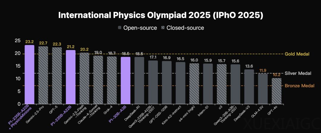 上海人工智能实验室团队推出的开源模型家族P1,成为首个在国际物理奥林匹克竞赛(IPhO 2025)理论考试中达到金牌线的开源模型。P1-235B-A22B在IPhO 2025中取得21.2/30分,仅次于Gemini-2.5-Pro与GPT-5。该模型在团队构建的HiPhO基准测试中,平均成绩从35.9提高到38.4,超过Gemini-2.5-Pro(37.7)和GPT-5(37.4),在33个顶流模型中排名第一。此外,在中国物理奥林匹克(CPhO 2025)人工评分中,P1-235B-A22B获得227/320分,显著超过当届人类金牌第一名选手的199分。