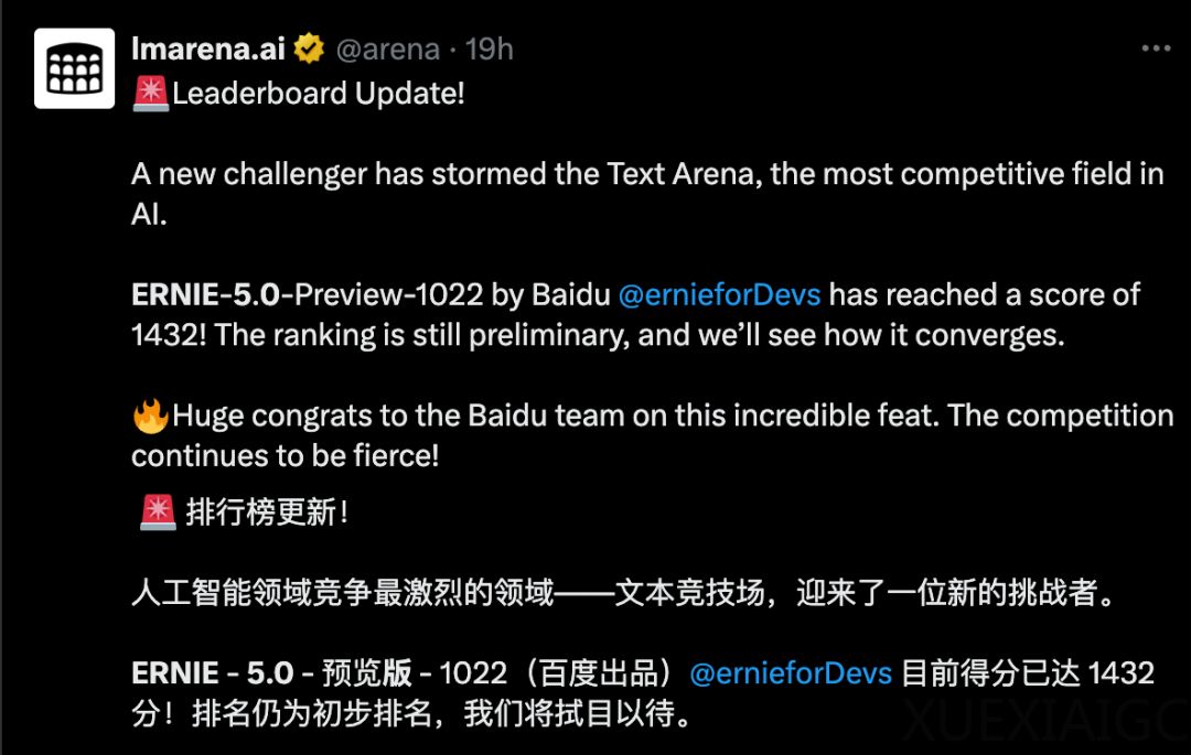 百度即将在年度百度世界大会上发布新一代文心大模型ERNIE-5.0。AI评测平台LMArena最新数据显示,其预览版ERNIE-5.0-Preview-1022以1432分跃居全球文本大模型第一梯队,国内排名首位,甚至超过GPT-5-High版本。该平台采用匿名对战、用户投票与Elo动态排名相结合的机制,通过消除品牌偏见提升评测公正性,其方法论已获得包括a16z在内的顶级投资机构认可,近期完成1亿美元种子轮融资。
