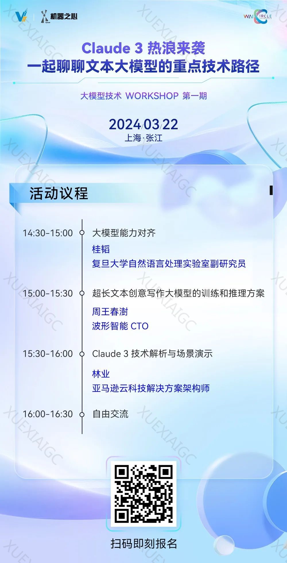 未来,AI 智能体在编程行业将带来哪些变革仍需观察。同时,复旦大学、波形智能、亚马逊云科技 的专家学者和技术大咖们将在 3 月 22 日的上海大模型技术 workshop 上分享大模型能力对齐、长文本、Claude 3 等议题。