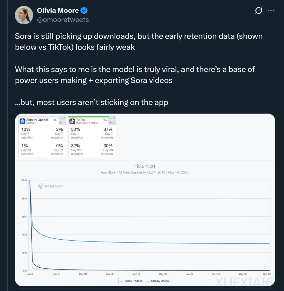 Sora APP作为OpenAI基于Sora 2视频模型开发的短视频平台,初期凭借AI玩法迅速爆发,5天内下载量突破百万,超越ChatGPT同期增速,并登顶App Store免费榜。然而,a16z合伙人Olivia Moore的数据显示,其用户留存率从首日的10%骤降至60天后的0%,排名跌至第22位,甚至落后于麦当劳等非竞品应用。这一现象揭示了“尝鲜式”用户行为的普遍性——尽管开放注册和功能更新(如角色客串、视频拼接)试图提升粘性,但核心问题未解。