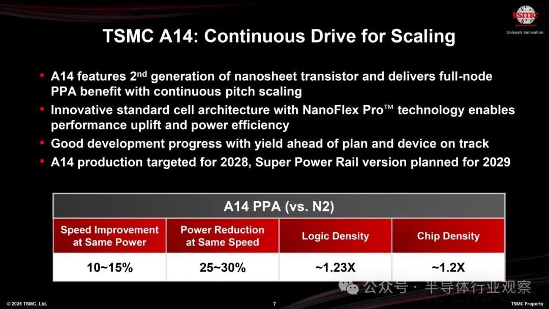 台积电在TSMC Symposium 2025上发布了一系列新技术,并更新了其技术路线图,展示了其在半导体领域的持续创新。第二代GAA工艺14A首次曝光,计划于2028年投产,预计在相同功耗下速度提升15%,或在相同速度下功耗降低30%,逻辑密度提升20%以上。该工艺旨在推动人工智能(AI)转型,并通过提升智能手机的内置AI功能,使其更加智能。台积电凭借其在纳米片晶体管设计与技术协同优化方面的经验,正在将其TSMC NanoFlex标准单元架构升级为NanoFlex Pro,以实现更高的性能、能效和设计灵活性。