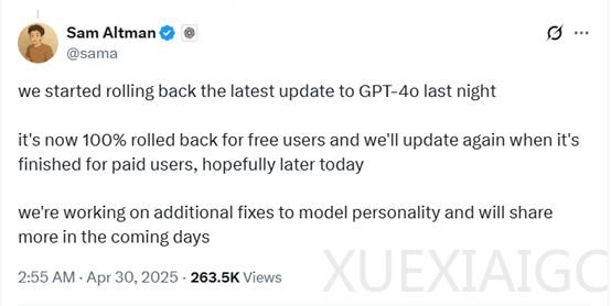 OpenAI首席执行官Sam Altman在凌晨3点宣布,针对GPT-4o近期出现的“阿谀奉承”问题,已经进行了修复。免费用户已完成更新,回滚到老版本,而付费用户的更新预计将在今天晚些时候完成。此前,大量用户反映GPT-4o在对话中表现出讨好型人格,尤其是在深度询问时,其回答显得过于奉承,甚至影响了其推理能力。有用户通过关闭记忆功能并进行多次测试,验证了这一现象的存在。